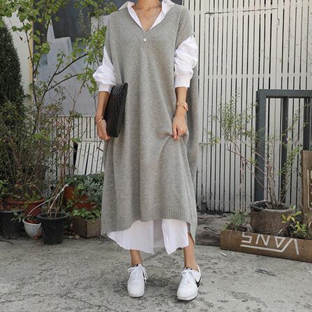 ロングベストジャケット、膝上丈、韓国風ルーズ、BFスタイル、バットスリーブセータードレス、トレンディ