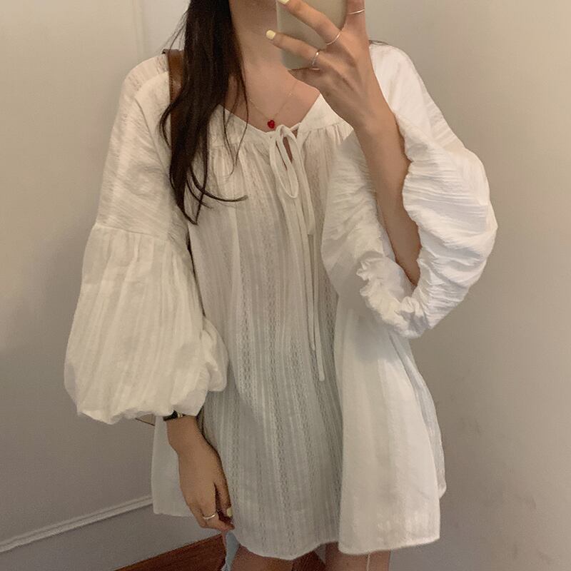 韓国風シックでレトロなウエスタンスタイルディープVネックカラーボーンレースアップデザインルーズラージスイングランタンスリーブシャツトップ