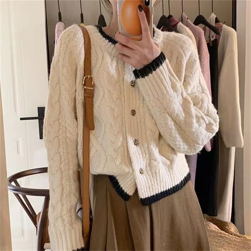 柔らかいツイストコンフリクトカラー、セーターコート女性秋冬カジュアル、バラボタンゆるいニットカーディガン上着
