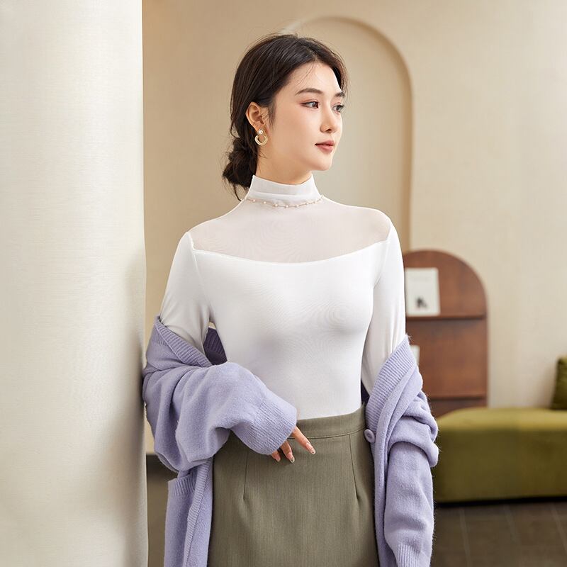 秋冬の半高襟のニットのシャツ長袖の薄いタイプの透明なガーゼのシャツのレースの上着。